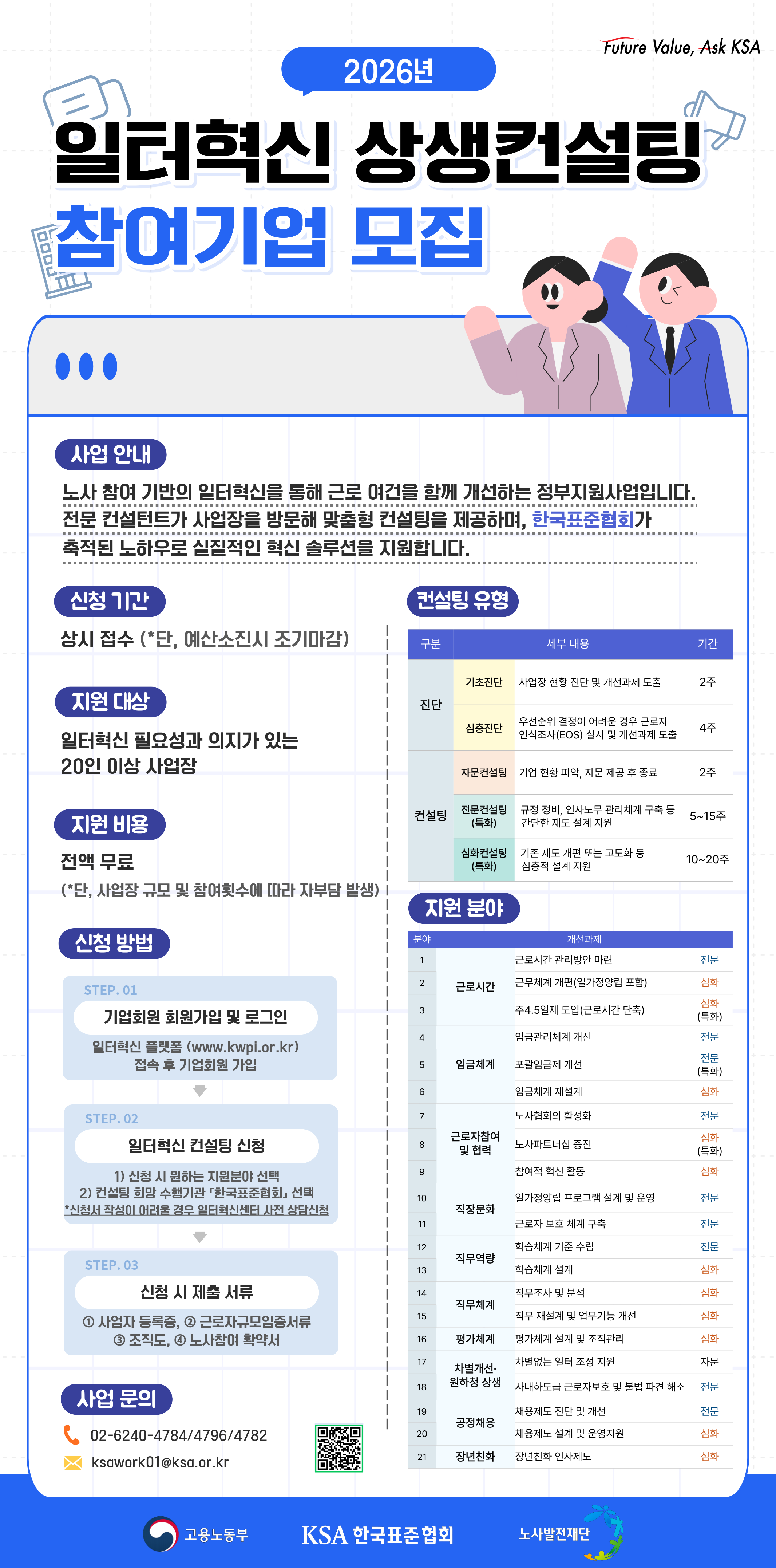 💼 지원 분야: 근로시간, 임금체계, 직무체계, 평가체계, 조직문화, 직무역량, 공정채용, 장년친화 등 기업 현장에 필요한 다양한 분야