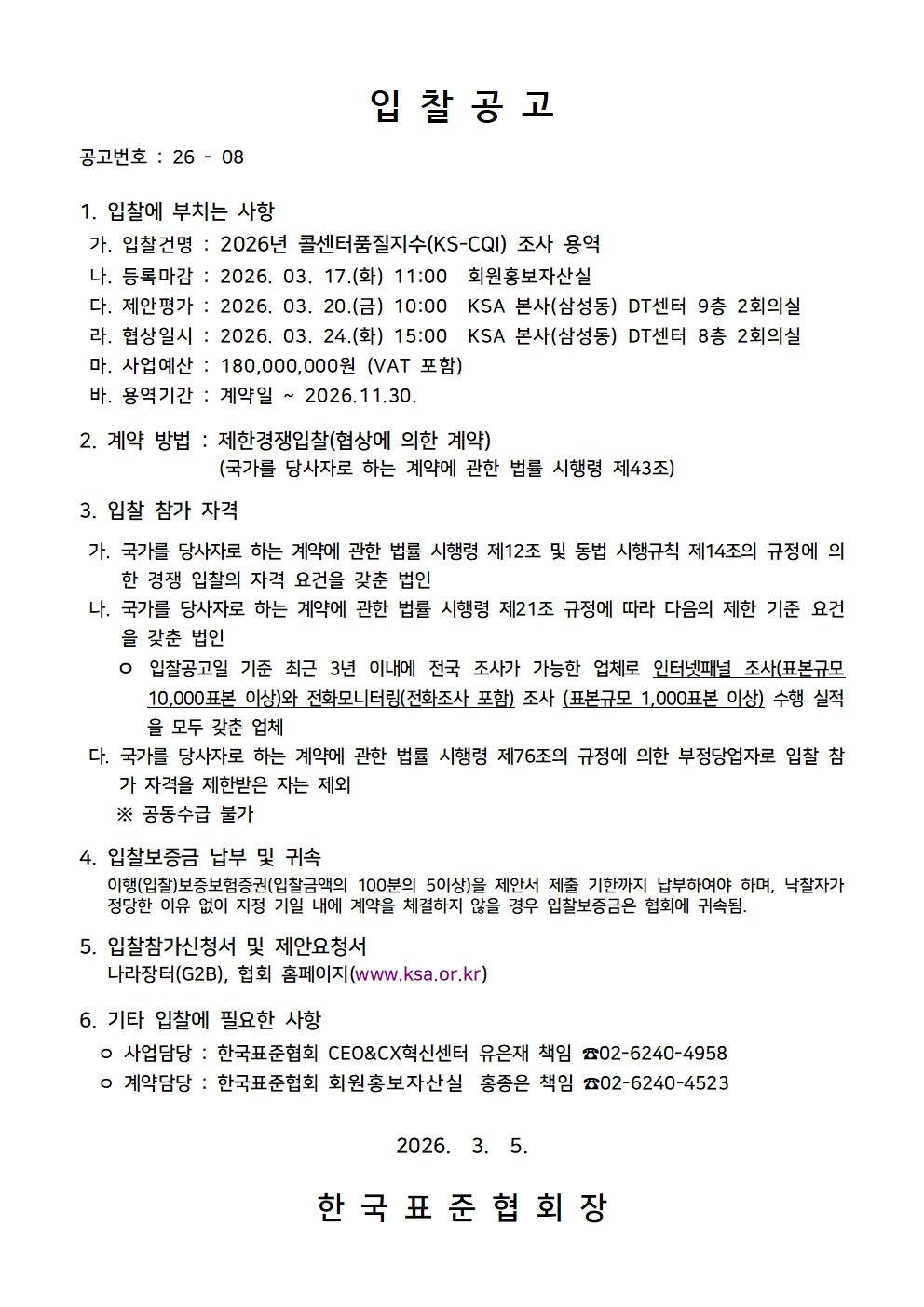 [입찰공고]2026 콜센터품질지수(KS-CQI) 조사 용역